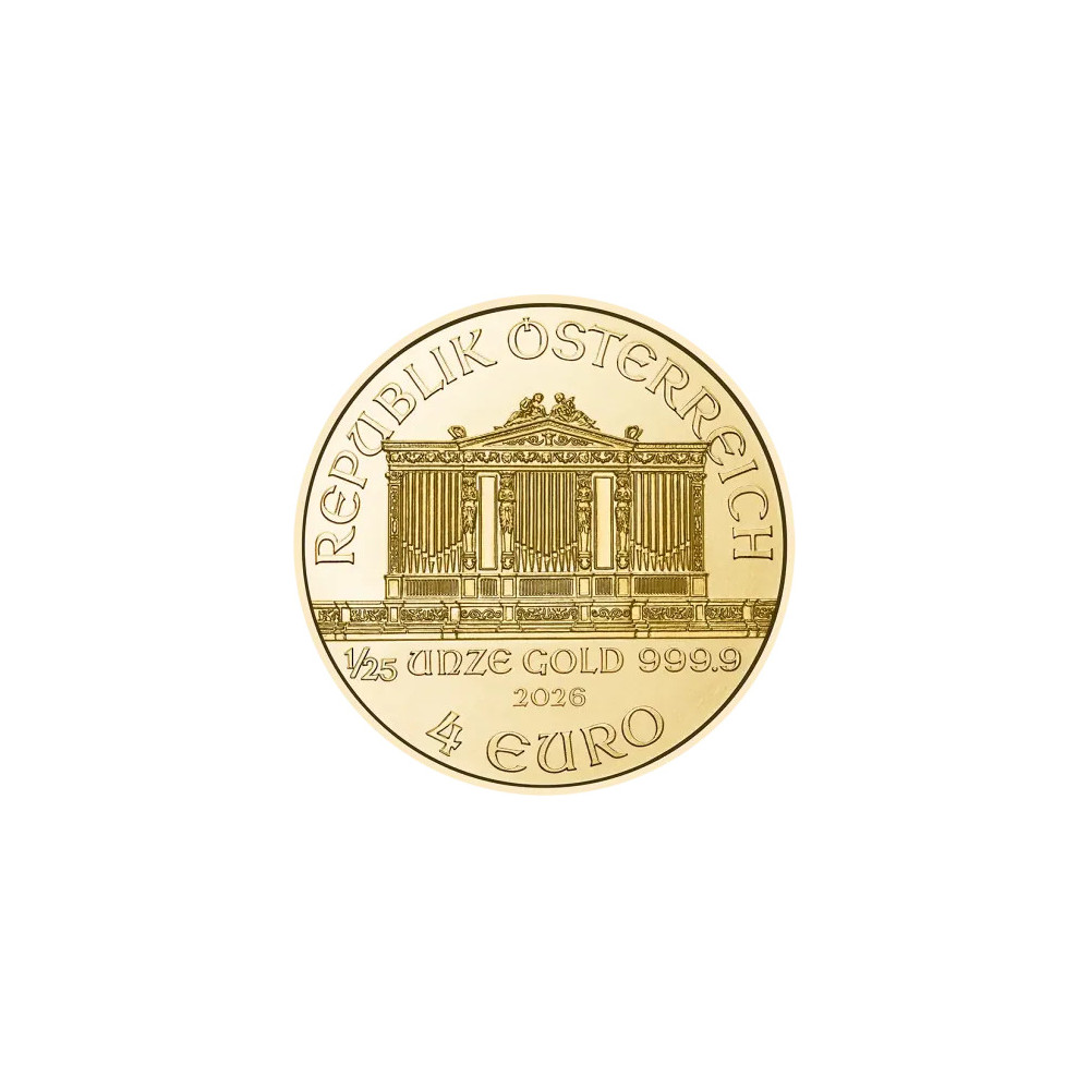 Своим названием Венская филармония обязана знаменитому австрийскому оркестру, одному из лучших в мире. На лицевой стороне золотой монеты изображен большой орган венского Музикферайна. Под органом отчеканены масса 1/25 унции, проба 999,9, год чеканки и номинал 4 евро. Над ним отчеканена надпись "REPUPLIK ÖSTERREICH". На оборотной стороне изображены музыкальные инструменты филармонического оркестра, а по верхнему краю можно увидеть название оркестра и надпись на золотой монете "WIENER PHILHAMRONIKER". Как и вышеупомянутые золотые монеты, Венский филармонический оркестр доступен в размерах 1 унция, 1/2 унции, 1/4 унции и 1/10 унции.